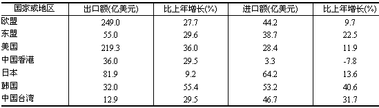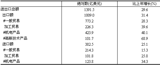 全年進出口總額為1391.5億美元,比上年增長29.6%,其中進口382.5億美元,增長25.1%,出口1009億美元,增長31.4%(見表5)。