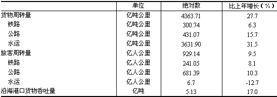 。 全年鐵路、公路和水運等運輸方式完成貨物周轉量4363.7億噸公里,比上年增長27.7% ; 旅客周轉量929.1億人公里,增長9.5%