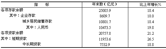 年末金融機構本外幣各項存款余額25005.9億元,比上年末增長18.4%,其中人民幣存款余額增長19.1%。全部金融機構本外幣各項貸款余額20757.8億元,比上年末增長21.2%,其中人民幣貸款余額增長21.7%。年末城鄉居民本外幣儲蓄存款余額10801.7億元(見表8),比上年末增長18.4%。