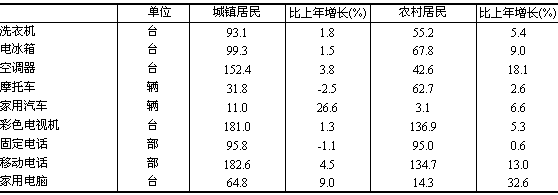 %。城鎮居民家庭恩格爾系數(即居民家庭食品消費支出占家庭消費總支出的比重)為32.9%,農村居民家庭恩格爾系數為37.2%,分別比上年下降0.9和1.4個百分點。城鎮居民人均住房使用面積26.4平方米,比上年末增加0.3平方米;農村居民人均居住面積55.6平方米,比上年末增加0.6平方米。年末城鄉居民家庭耐用消費品擁有量繼續增加(見表9),其中每百戶城鎮居民家用汽車擁有量11輛。
