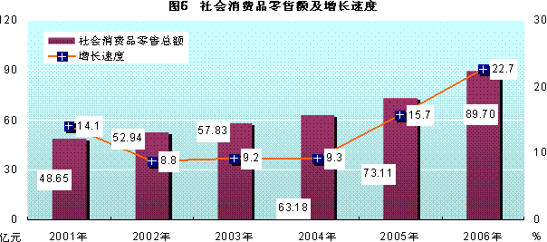 全年實現社會消費品零售總額89.70億元,比上年增長22.7%。其中:城市消費品零售額43.80億元,增長32.7%;縣及縣以下消費品零售額45.91億元,增長14.5%。分行業看,批發和零售業零售額71.61億元,增長21.0%;住宿和餐飲業零售額15.76億元,增長27.3%;其他行業零售額2.34億元,增長53.2%。