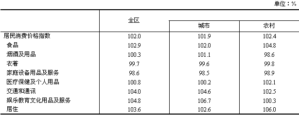 在限額以上批發和零售業中,服裝鞋帽針紡織品類零售額增長33.0%,石油制品類零售額增長17.3%,汽車類零售額增長72.9%,金銀珠寶類零售額增長24.0%,家用電器和音像器材類零售額增長14.6%。 全區居民消費價格總水平比上年上漲2.0%。其中:城市上漲1.9%,農村上漲2.4%。服務項目價格上漲5.0%;消費品價格上漲1.5%。在各類消費品中,娛樂教育文化用品及服務、交通通訊、居住類和食品類價格上漲幅度較大,分別上漲了4.8%、4.0%、3.6%和2.9%,其他各類價格略有上漲或下降。 商品零售價格上漲0.2%;農業生產資料價格上漲0.4%;農產品收購價格上漲3.3%;工業品出廠價格上漲6.0%。