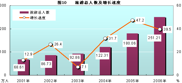 全年接待國內外旅游者251.21萬人次,比上年增長39.5%。其中:接待國內旅游者235.73萬人次,增長40.4%;接待海外旅游人數15.48萬人次,增長27.6%。全年實現旅游總收入27.71億元,比上年增長43.2%。實現外匯收入6094萬美元,比上年增長37.1%。