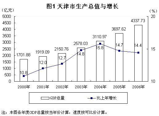 2006年是“十一五”發展的第一年。全市人民在市委、市政府的正確領導下,以鄧小平理論和“三個代表”重要思想為指導,以科學發展觀為統領,認真貫徹落實黨中央、國務院關于加快推進濱海新區開發開放的決定和各項部署,扎實推進“三步走”戰略和五大戰略舉措,加快經濟增長方式轉變,全面推進和諧天津建設,全市經濟平穩快速增長,效益質量進一步提高,各項社會事業全面發展,人民生活水平繼續提高,實現了“十一五”良好開局。