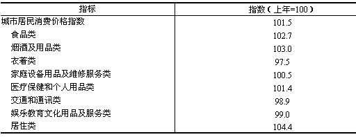 格 城市居民消費價格指數為101.5,即比上年上漲1.5%。八大類價格呈現五升三降格局(見表1)。