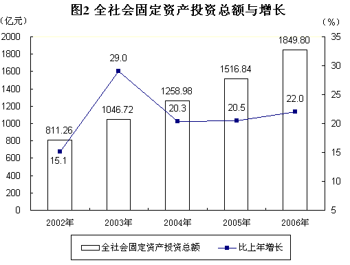 城市商品零售價格指數為100.4。工業品出廠價格指數為100.6。原材料燃料及動力購進價格指數為104.7。房屋銷售價格指數為106.7,其中商品住宅價格指數為107.1。 固定資產投資 全社會固定資產投資完成1849.80億元,比上年增長22.0%(見圖2)。其中,城鎮固定資產投資1709.66億元,增長23.4%;農村固定資產投資140.14億元,增長6.9%。
