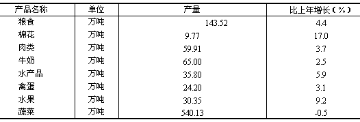 在城鎮固定資產投資中,第一產業投資3.38億元。第二產業投資701.83億元,增長29.2%。其中工業投資690.34億元,增長29.6%。第三產業投資1004.45億元,增長20%。其中交通運輸倉儲郵政業、房地產業和水利環境公共設施管理業投資分別增長21.5%、22.0%和21.8%。重點項目建設得到加強,10億元以上的大項目共完成投資746.94億元,增長51.3%。 農業和農村建設 全市農業總產值完成251.50億元,比上年增長3.7%。在農業總產值中,種植業產值105.27億元,增長3.6%;林業產值1.98億元,增長2.5%;畜牧業產值104.89億元,增長3.1%;漁業產值39.36億元,增長6.0%。養殖業(畜牧業和漁業)占農業總產值的比重為57.4%。 農業生產能力繼續提高。全年糧食種植面積442.82萬畝,比上年增加11.33萬畝,糧食總產量143.52萬噸,增長4.4%。棉花種植面積106.44萬畝,棉花產量9.77萬噸,增長17.0%。魚、肉、蛋、奶等主要農副產品產量比上年增加(見表2)。
