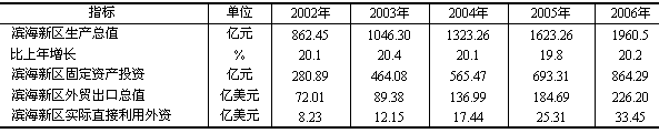 %,旅游收入增長11.2%。全市共有15.3萬人次出國出境旅游,增長4.8%,旅游支出20.3億元,增長5.7%。年末全市擁有星級賓館、飯店114家;國際、國內旅行社264家,其中國際旅行社29家,國內旅行社235家。 濱海新區 隨著濱海新區開發開放被納入國家總體發展戰略,并被批準為全國綜合配套改革試驗區和設立東疆保稅港區,濱海新區掀起新一輪開發開放熱潮;A設施建設全面提速,天津濱海國際機場擴建、天津港25萬噸級深水航道、30萬噸級原油碼頭工程和北港池集裝箱碼頭三期工程建設進展順利,100萬噸乙烯、北疆電廠、東疆保稅港區等一批重點項目開工建設,空客A320中國總裝線項目落戶,渤海銀行開業,全國第一只產業投資基金——“渤海產業投資基金”正式掛牌成立。 全年濱海新區實現生產總值1960.5億元,按可比價格計算,比上年增長20.2%,對全市經濟增長貢獻率為51.4%。電子通信、石油開采、汽車制造、現代冶金為支柱構成的高層次產業結構優勢明顯,現代醫藥、航空航天、新材料等高新技術產業群迅速發展。新區全年完成工業總產值5200.52億元,增長31.3%。完成固定資產投資864.29億元,增長24.7%。全年直接利用外資合同金額61.80億美元,占全市的76.2%,增長24.0%,實際到位33.45億美元,占全市的81.0%,增長31.1%。新區經濟外向度不斷加大,全年外貿出口達到226.20億美元,占全市的67.4%,增長22.5%(見表4)。開發區經濟總量迅速擴大,增長速度連續6年保持在25%以上,綜合實力在全國開發區中繼續保持領先;工業總產值完成3004.16億元,增長25.1%;固定資產投資完成220.09億元,首次超過200億元;合同外資額32.54億美元,實際到位16.08億美元。