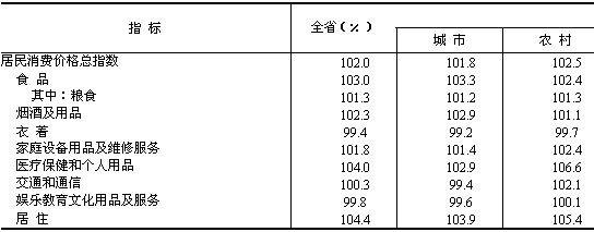 市場物價溫和上漲。居民消費價格總水平比上年上漲2.0%,其中城市上漲1.8%,農村上漲2.5%。商品零售價格指數上漲1.2%。農業生產資料價格指數上漲3.6%。工業品出廠價格指數上漲1.0%。原材料、燃料、動力購進價格指數上漲2.6%。固定資產投資價格指數上漲1.5%。土地交易價格指數上漲5.0%。房屋銷售價格指數上漲4.3%,房屋租賃及物業管理價格指數分別上漲3.1%和0.9%。農產品生產價格指數上漲0.2%,其中,谷物上漲1.5%,棉花下降2.5%,油料上漲6.1%,畜產品下降1.3%。
