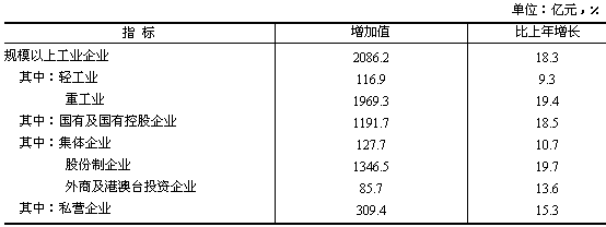 工業生產較快增長,產銷銜接良好。全年全省完成全部工業增加值2482.7億元,比上年增長16.0%。其中規模以上工業增加值2086.2億元,增長18.3%;產品銷售率97.6%。