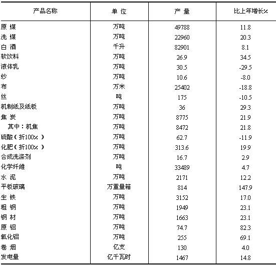 (全社會產量5.8億噸,增長7.1%),洗煤增長20.3%,焦炭增長21.9%,生鐵增長17.0%,粗鋼增長23.1%,鋼材增長23.1%,原鋁增長82.3%,氧化鋁增長69.1%,發電量增長14.8%。
