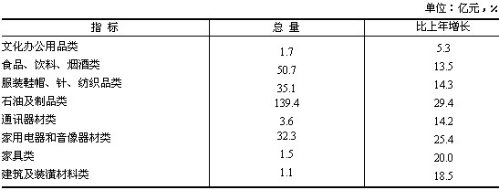 消費品市場銷售穩中趨旺。全年全省實現社會消費品零售總額1613.4億元,比上年增長15.2%,扣除價格上漲因素,實際增長13.8%。其中城市消費品零售額1048.6億元,增長16.2%,縣的消費品零售額297.8億元,增長13.5%,縣以下消費品零售額267.1億元,增長13.1%。分行業看,批發零售業零售額1363.2億元,增長14.8%;住宿和餐飲業零售額196.3億元,增長20.2%;其他行業零售額53.9億元,增長6.8%。