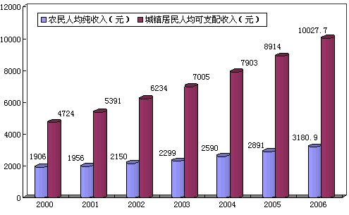 城鄉居民收入較快增長。全年城鎮居民人均可支配收入突破萬元大關,達到10027.7元,比上年增長12.5%,扣除價格上漲因素,實際增長10.5%;城鎮居民人均消費性支出7170.9元,增長13.1%。農村居民人均純收入邁上3000元臺階,達到3180.9元,增長10.0%,實際增長7.6%;農民人均生活消費支出2253.3元,增長20.0%。城市居民家庭恩格爾系數(即居民家庭食品消費支出占家庭消費支出的比重)31.4%,農村居民家庭恩格爾系數38.5%。城鎮占人口20%的低收入者收入4213.4元,增長12.9%;農村占人口20%的低收入者收入1194.4元,增長10.1%!