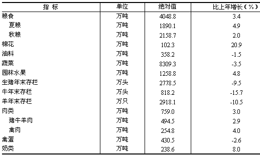 農林牧漁業全面發展。農林牧漁業實現增加值2138.9億元,比上年增長5.2%。其中,農業增加值1260.6億元,增長5.1%,對農林牧漁業增加值增長的貢獻率達到60.0%;林業增加值45.9億元,增長8.3%;牧業增加值466.4億元,增長4.8%;漁業增加值322.0億元,增長3.6%;農林牧漁服務業增加值44.0億元,增長22.2%。 主要農牧產品產量穩步增長。糧食總產量達到4048.8萬噸,創2000年以來最高水平,比上年增長3.4%;棉花產量突破100萬噸,增長20.9%。