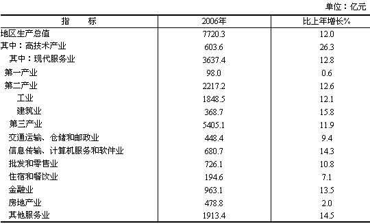 初步核算,全市實現地區生產總值7720.3億元,比上年增長12%,連續第8年實現兩位數增長。其中,第一產業增加值98億元,增長0.6%;第二產業增加值2217.2億元,增長12.6%;第三產業增加值5405.1億元,增長11.9%,占地區生產總值的比重達到70%。按常住人口計算,當年人均GDP達到49505元(折合6210美元),比上年增長8.8%。三次產業結構由上年的1.4:29.5:69.1變化為1.3:28.7:70。 全市現代服務業實現增加值3637.4