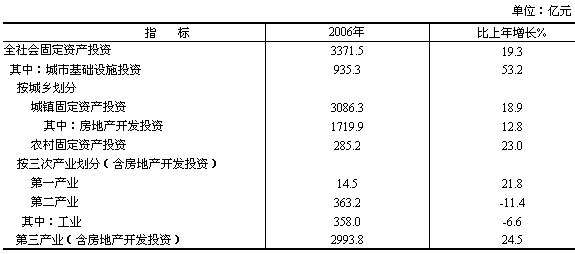 固定資產投資:全年完成全社會固定資產投資3371.5億元,比上年增長19.3%,增幅比上年提高7.5個百分點。在全社會固定資產投資中,完成城鎮投資3086.3億元,增長18.9%,增幅高于上年7.7個百分點;其中房地產開發投資1719.9億元,增長12.8%,增幅提高9.3個百分點,占全社會固定資產投資的比重為51%,比上年下降2.9個百分點。完成農村投資285.2億元,增長23%,增幅高于上年4.3個百分點;其中農村基礎設施投資84.2億元,增長89.6%。