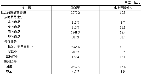 國內貿易:全市實現社會消費品零售額3275.2億元,比上年增長12.8%,扣除物價上漲因素,實際增長12.6%。在限額以上批發零售企業零售額中,通訊器材類增長21.2%,家用電器和音像器材類增長11.9%,家具類增長26.4%,汽車類增長17.3%,石油及制品類增長35.1%。