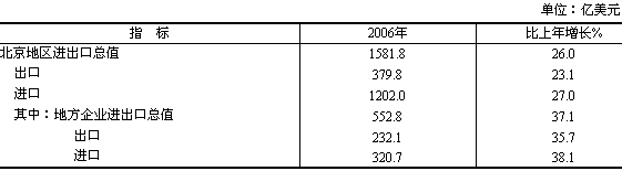 全市銷售機動車71.4萬輛,比上年增長25.2%。其中,新車39.1萬輛,增長5.1%,舊車32.3萬輛,增長62.8%。 對外貿易:北京地區進出口總值1581.8億美元,比上年增長26%;其中出口379.8億美元,增長23.1%。地方企業進出口總值552.8億美元,比上年增長37.1%;其中出口232.1億美元,增長35.7%。地方企業出口中,機電產品出口172.8億美元,增長43.4%;高新技術產品出口129.1億美元,增長43.6%;占地方出口的比重分別達到74.5%和55.6%(二者有交叉部分),分別比上年提高4個和3個百分點。