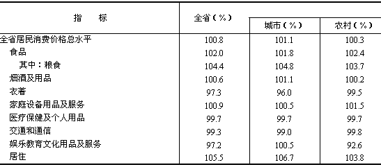 初步核算,全省實現生產總值7501.63億元,按可比價格計算,比上年增長13.4%。其中,第一產業增加值885.23億元,增長2.5%;第二產業增加值3736.08億元,增長17.0%;第三產業增加值2880.32億元,增長12.6%。人均地區生產總值21152元,比上年增長12.7%。 產業結構繼續調整。第一產業有所調減,第二產業繼續保持增勢,第三產業發展穩定。三次產業比例由上年的12.8:48.7:38.5調整為11.8:49.8:38.4。 居民消費價格總水平比上年上漲0.8%(見表1),其中城市上漲1.1%,農村上漲0.3%;消費品價格上漲1.2%,服務價格下降0.5%。工業品出廠價格下降0.8%。原材料燃料動力購進價格上漲3.9%。農業生產資料價格上漲0.9%,比上年低7.2個百分點。