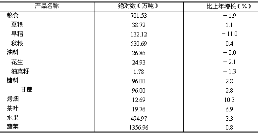 全省農林牧漁業完成總產值1473.41億元,比上年增長3.0%,增幅比上年回落1.7個百分點。 糧食種植面積2093.76萬畝,比上年減少68.18萬畝;煙葉種植面積103.69萬畝,增加3.52萬畝;蔬菜種植面積956.67萬畝,增加8.59萬畝;花卉種植面積15.86萬畝,增加0.74萬畝;油料種植面積182.21萬畝,減少1.38萬畝。糧食產量701.53萬噸,比上年減產1.9%;煙葉產量12.84萬噸,增產10.1%;油料產量26.86萬噸,減產2.0%;蔬菜產量1356.96萬噸,增產0.8%,水果產量494.97萬噸,增產3.3%(見表2)。