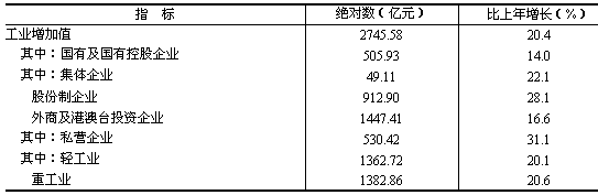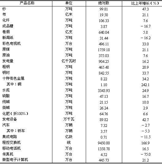 發電量904.25億千瓦小時,增長16.2%;原煤1759.18萬噸,增長21.1%。 黑色金屬冶煉及壓延加工業總產值比上年增長32.9%,非金屬礦物制品工業增長28.6%,化學原料及化學制品制造業增長13.5%,有色金屬冶煉及壓延加工業增長31.1%。主要原材料產品中,鋼材842.55萬噸,增長33.7%;粗鋼產量465.48萬噸,增長20.9%;水泥3343.93萬噸,增長24.9%;十種有色金屬增長34.2%,硫酸、純堿、燒堿等主要化工產品增長2.9%至16.7%。 通用設備制造業總產值比上年增長27.6%,電氣機械及器材制造業增長16.0%,交通運輸設備制造業增長24.8%。發電設備增長42.7%;汽車產量7.32萬輛,下降2.7%,其中轎車3.57萬輛,下降5.3%。 高技術產業總產值比上年增長26.4%。在高技術產業中,通信設備、計算機及其他電子設備制造業增長29.6%,其中彩色電視機、程控交換機、移動電話機、微型電子計算機等產品產量分別增長16.5%至166.9%(工業主要產品產量見表4)。