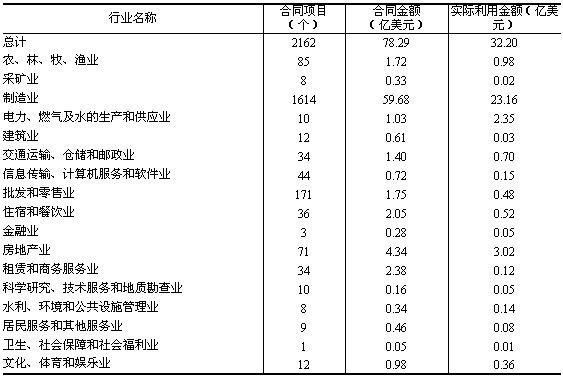 表8:2006年外商直接投資分行業情況(驗資口徑)