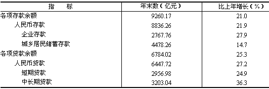 全省年末金融機構本外幣各項存款余額9260.17億元,比上年增長21.0%;全部金融機構本外幣各項貸款余額6784.02億元,增長25.3%(見表9)。 農村合作金融機構人民幣貸款余額543.67億元,比上年末增加108.36億元。金融機構人民幣個人貸款余額1302.42億元,增長48.9%。