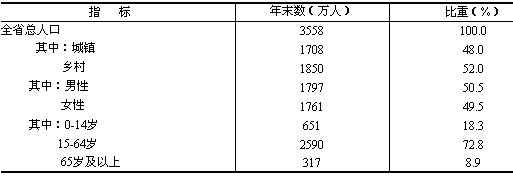 全省年末常住總人口3558萬人(見表10),凈增人口23萬人。出生人口42.56萬人,出生率12.00‰;死亡人口20.39萬人,死亡率5.75‰;自然增長率6.25‰。