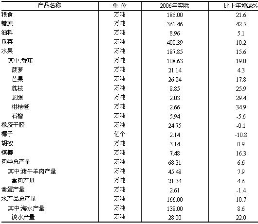 。ㄒ唬┙洕偭 整體經濟加速增長,綜合實力明顯增強。初步核算,并經國家統計局聯審評估認定,2006年,全省生產總值(GDP)1052.43億元,按可比價格計算,比上年增長12.5%,增速提高2.3個百分點,自2003年走出“房地產泡沫”陰影進入兩位數增長平臺后,創1994年以來生產總值增速新高,提前一年實現生產總值跨千億目標;其中,第一產業增加值344.20億元,增長9.1%;第二產業增加值287.79億元,增長19.8%;第三產業增加值420.44億元,增長11.0%。按常住人口計算,人均生產總值12650元,以當年平均匯率折算約合1617美元,增長11.3%。 產業結構進一步調整優化,新型工業和現代服務業得到大力發展。2006年,在全省生產總值中,第一產業所占比重由上年的32.96%降至32.71%,對經濟增長貢獻率為24.4%;第二產業所占比重由26.07%提高至27.35%,對經濟增長貢獻率為38.8%,居三次產業貢獻率首位;第三產業所占比重由40.97%降至39.94%,對經濟增長貢獻率為36.8%。從各產業內部結構看,第一產業中優勢農業加快發展,漁業、畜牧業、瓜菜、水果等四大優勢農業對農業經濟增長的貢獻率達80.8%。第二產業中高新技術工業比重明顯提高,石油加工、化肥、紙漿、汽車制造、制藥、旋窯水泥等新型工業創造產值對規模以上工業經濟增長貢獻率達77.5%,經濟增長的技術與知識含量顯著提高。第三產業中現代服務業發展喜人。旅游客源結構發生新的變化,接待境外游客增幅較境內游客增幅快38.0個百分點;房地產市場在宏觀調控中理性發展,銷售面積大于竣工面積;金融環境進一步改善,資產質量明顯提高,金融機構本外幣存貸總量同步增長;會展產業方興未艾,成功主辦或協辦博鰲亞洲論壇年會、兩岸農業合作論壇、東亞海大會及部長會議、第一屆世界海南青年大會等國際性大型會議。 宏觀經濟景氣上揚,經濟運行質量和效益提高。2006年,反映宏觀經濟運行質量的企業家信心指數為134.1,比上年提高9.6點,已連續四年處于較景氣區間上行;反映微觀主體運營狀況的企業景氣指數為131.7,提高5.2點,企業生產經營狀況不斷趨好,預期生產信心明顯增強。全省全口徑財政收入179.88億元,比上年增長24.3%。其中,地方財政收入102.29億元,增長21.1%,提前一年實現地方財政收入突破百億元目標。在地方財政收入中,一般預算收入81.76億元,比上年增長19.8%;基金收入20.53億元,比上年增長26.7%。稅收收入總額139.21億元,比上年增長25.2%。按各項稅收分,企業所得稅比上年增長24.9%,增值稅增長11.1%,營業稅增長21.3%,個人所得稅增長11.1%,房產稅增長18.2%。上劃中央“兩稅”收入54.69億元,增長37.7%;上劃中央所得稅收入14.38億元,增長18.9%。列入統計監測的420家規模以上工業企業經濟效益綜合指數205.65%,比上年提高9.4個百分點,創1997年建立工業企業綜合效益指數統計制度以來新高;實現利潤總額41.50億元,增長21.9%。 。ǘ┺r林牧漁業 農業內部結構繼續調整優化,農業生產保持較快發展。加大支農力度,扎實推進社會主義新農村建設,農村和農業經濟加快發展。2006年,全省農業增加值344.20億元,比上年增長9.1%,增速提高3.1個百分點。在農業內部,漁業、畜牧業、瓜菜、水果等優勢農業持續較快發展,所占比重明顯提高,成為農業經濟較快增長的主導力量。全年水產品產量166萬噸,同比增長10.7%;肉類總量68.31萬噸,同比增長6.6%;瓜菜產量400.39萬噸,增長10.2%;水果產量187.85萬噸,增長15.6%。漁業、畜牧業、瓜菜、水果四大優勢產業對農業經濟增長的貢獻率達80.8%。農業經濟效益隨著產業結構的調整和農產品價格上漲得到顯著提高。
