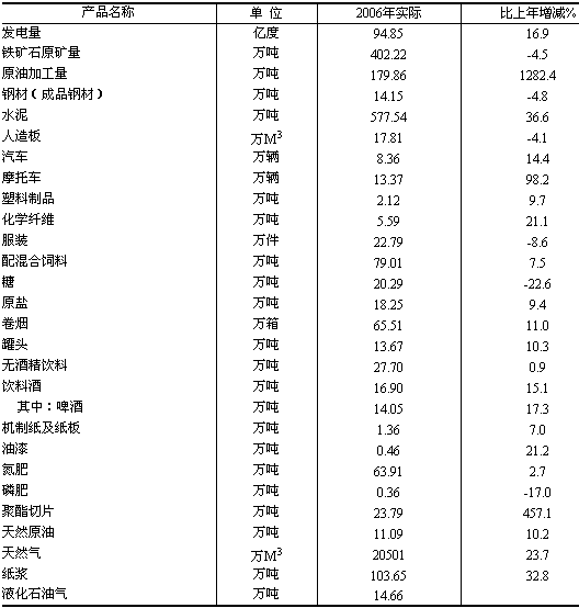 60萬噸甲醇、110萬噸鐵精粉、8萬噸本乙烯、15萬臺汽車發動機等一批大項目陸續投產并產生即期效益,石油加工、化肥、紙漿、汽車制造、制藥、旋窯水泥等新型工業成為工業經濟新的增長亮點,有效地推動了工業經濟快速發展。2006年,工業完成增加值217.55億元,比上年增長24.1%,增速提高了7.1個百分點,對經濟增長貢獻率為33.6%,是全省經濟增長的“火車頭”,占生產總值比重由上年的19.07%提高至20.67%,提高1.6個百分點。其中,規模以上工業完成增加值197.66億元,增長26.5%。在規模以上工業增加值中,國有控股企業完成增加值101.64億元,增長14.6%。分輕重工業看,重工業完成增加值137.85億元,增長36.8%;輕工業完成增加值59.81億元,增長11.4%。分經濟類型看,國有企業完成增加值41.37億元,增長8.5%;集體企業完成增加值0.40億元,增長23.7%;股份合作企業完成增加值0.07億元,增長24.9%;股份制企業完成增加值79.16億元,增長9.3%;外商及港澳臺企業完成增加值70.19億元,增長66.7
