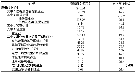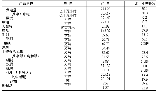 全省工業增加值265億元,按可比價格計算,比上年增長18.7%。規模以上(全部國有工業及年產品銷售收入在500萬元以上的非國有工業企業)工業增加值240.34億元,增長20.4%;新產品產值8.74億元,比上年增長33.6%。 全年四大支柱產業創造增加值142.10億元,比上年增長17.7%。其中,石油和天然氣開采業46.81億元,增長5.5%,水力發電業21.52億元,增長23.8%,有色金屬業54.45億元,增長22.0%,鹽化工業19.32億元,增長31.6%。
