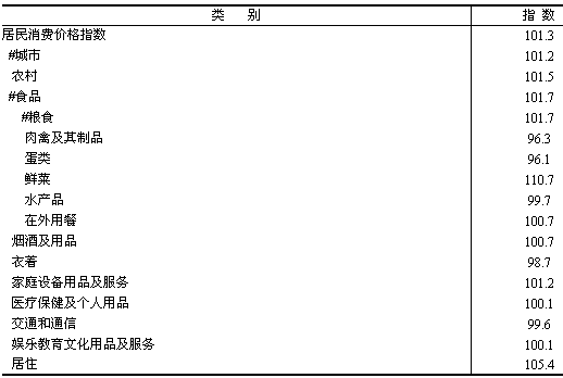 表1:2006年全省居民消費價格指數 (以上年同期為100)