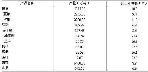 全年全省糧食種植面積13954.62萬畝,比上年增加224.50萬畝;其中,小麥種植面積7510.01萬畝,增加66.00萬畝,優質專用小麥種植面積占小麥種植面積的比重為61.4%。棉花種植面積1200.92萬畝,增加28.71萬畝。油料種植面積2326.50萬畝,減少82.25萬畝。蔬菜種植面積2597.70萬畝,增加203.92萬畝。 全年全省糧食產量5055.00萬噸,比上年增產10.3%;棉花產量83.00萬噸,增產22.6%;油料產量479.99萬噸,增產6.8%。全年肉類總產量737.00萬噸,增長7.0%;禽蛋產量400.82萬噸,增長6.8%;牛奶產量147.68萬噸,增長42.0%。全年水產品產量60.10萬噸,增長16.3%。