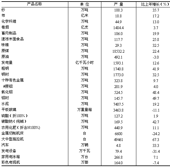 全省規模以上工業中,煤炭開采和洗選業實現增加值380.71億元,比上年增長20.6%;農副食品加工業增加值270.72億元,增長25.1%;紡織業增加值147.31億元,增長21.3%;化學原料及化學制品制造業增加值230.08億元,增長26.8%;非金屬礦物制品業增加值391.45億元,增長26.9%;黑色金屬冶煉及壓延加工業增加值242.08億元,增長24.7%;有色金屬冶煉及壓延加工業增加值298.88億元,增長18.2%;通用設備制造業增加值150.78億元,增長27.9%;專用設備制造業增加值132.27億元,增長23.0%;電力、熱力的生產和供應業增加值368.11億元,增長21.4%。 主要工業產品產量中,畜肉制品產量比上年增長19.9%,速凍米面食品增長25.8%,原煤增長22.4%,發電量增長12.6%,鋼材增長32.5%,鋁材增長49.7%,大中型拖拉機增長67.3%。