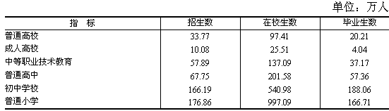 全年全省普通高等學校招生33.77萬人,在校生97.41萬人,畢業生20.21萬人。普通高中招生67.75萬人,在校生201.58萬人,畢業生57.36萬人。初中學校招生166.19萬人,在校生540.98萬人,畢業生188.06萬人。普通小學招生176.86萬人,在校生997.09萬人,畢業生166.71萬人。