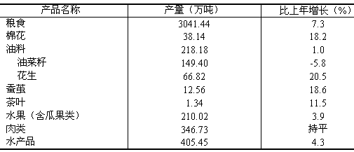 農業穩定發展。認真落實一系列支農惠農政策,加上有利的氣候條件,糧食增產、農業增效、農民增收保持良好勢頭。全年糧食總產量達3041.44萬噸,比上年增加206.85萬噸,增長7.3%。其中夏糧總產量939.14萬噸,比上年增長11.2%;秋糧總產量2102.30萬噸,增長5.6%。種植業結構發生變化,全年糧食種植面積為498.51萬公頃,比上年增加7.56萬公頃;棉花、油料種植面積分別為35.49萬公頃、81.23萬公頃,分別減少1.34萬公頃和3.46萬公頃。蔬菜面積117.36萬公頃,下降1.7%。優質、高效、安全和生態農業發展較快。 林牧漁業生產穩定。全年造林面積6.65萬公頃。多數畜產品產量持平,肉類總產量346.73萬噸,與上年持平,其中豬牛羊肉產量242.10萬噸,禽肉產量103.71萬噸;禽蛋總產量185.54萬噸,增長1.9%;牛奶總產量60.81萬噸,增長7.4%。全年水產品總產量405.45萬噸,增長4.3%;其中淡水產品286.37萬噸,海水產品119.08萬噸,分別增長4.1%和5.0%。