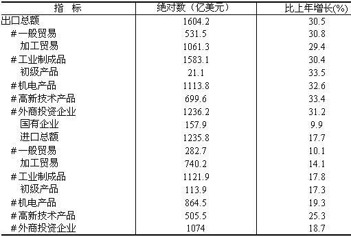 對外貿易平穩較快增長。全年進出口總額2840.0億美元,比上年增長24.6%。其中,出口總額1604.2億美元,增長30.5%;進口總額1235.8億美元,增長17.7%。出口商品結構不斷優化。機電產品、高新技術產品出口額占出口總額的比重分別為69.4%和43.6%。其中計算機與通信技術出口568.7億美元,占高新技術產品出口額的81.3%,增長31.0%。農產品出口額12.2億美元,增長33.1%。外商投資企業出口占出口總額的比重為77.1%。私營企業出口較快增長,出口額為165.3億美元,增長63.2%。對歐盟、美國、日本、香港特別行政區的出口分別為381.2億美元、363.8億美元、180.6億美元和155.7億美元,增長32.5%、33.5%、12.9%和14.5%;從東盟、韓國、臺灣省進口額171.8億美元、223.5億美元和249.8億美元,增長29.2%、3.0%和18.2%;對俄羅斯、拉丁美洲、非洲出口額11.4億美元、53.4億美元和26.9億美元,分別增長49.4%、62.7%和47.6%。