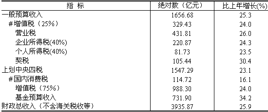 財政收入較快增長。全年實現地方財政一般預算收入1656.68億元,增收334.01億元,增長25.3%;基金收入731.9億元,增長34.2%,一般預算收入加上基金收入、上劃中央四稅1547.29億元,財政總收入為3935.87億元(不含海關稅收等612.28億元),增長25.9%。稅務部門征收的稅收中,外商及港澳臺投資企業、私營企業分別完成999.75億元和570.93億元,比上年增長26.0%和31.7%。