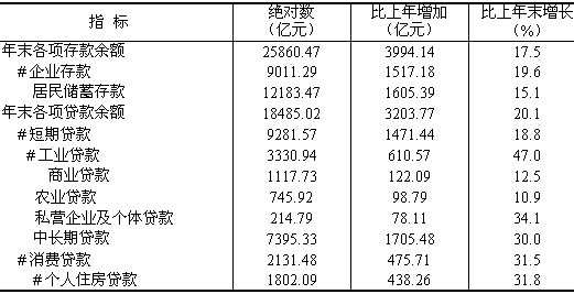 財政支出結構繼續調整。一般預算支出1987.59億元,增支314.19億元,可比增長15.2%;基金預算支出705.52億元,增支162.70億元,增長30.0%。全年農林水氣象支出119億元,增長22.0%;社會保障補助支出80.84億元,增長26.9%;醫療衛生支出88.74億元,教育支出297.96億元,科學支出10.56億元,分別增長18.2%、17.2%和32.8%;基本建設撥款184.09億元,企業挖潛改造資金71.65億元,行政管理費229.37億元,分別增長19.8%、13.1%和17.7%。 金融運行平穩。年末廣義貨幣供應量(M2)余額、狹義貨幣供應量(M1)余額和流通中現金(M0)余額為29024.09億元、11018.20億元和3501.85億元,分別比上年增長17.8%、21.7%和15.4%。年末全省金融機構人民幣貸款余額18485.02億元,比年初增加3203.77億元,同比多增1062.26億元;其中短期貸款增加1471.44億元,同比多增785.16億元。年末全省金融機構人民幣存款余額25860.47億元,比年初增加3994.14億元,同比多增375.46億元;其中,居民儲蓄存款增加1605.39億元,同比少增112.51億元;企業存款增加1517.18億元,同比多增739.88億元。
