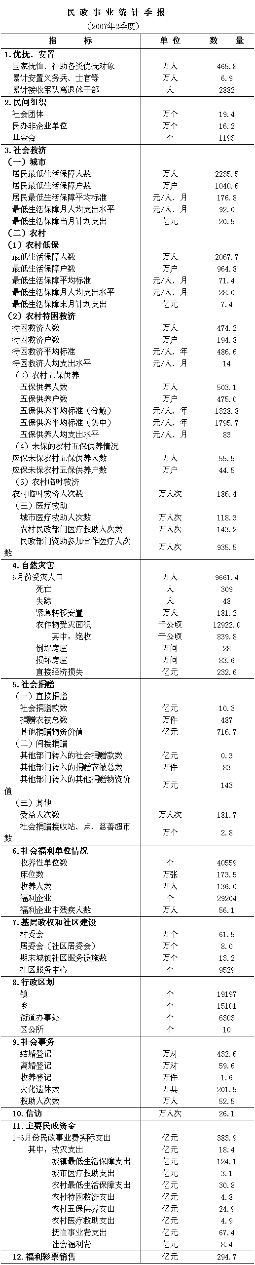 日前,民政部公布了2007年2季度民政事業統計數據。詳情如下: