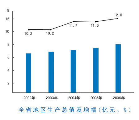 歷史將銘記“北大荒”的輝煌:半個多世紀以來,黑龍江省為國家提供了約占全國2/5的原油、2/3的木材、1/7的商品糧、十分之一的煤炭和大量的重型裝備。如今,在科學發展觀的指引下,黑龍江省重新踏上振興之旅,裝備工業、能源工業、哈大齊工業走廊等“亮點”頻現,“北大荒”的核心競爭力日益凸顯。 2002年以來,黑龍江省生產總值先后突破4000億元、5000億元、6000億元大關,2006年達到6216.8億元,年均增長11.1%,連續五年保持兩位數增長,高出全國0.6個百分點。同時,經濟發展軟硬環境不斷改善,政府宏觀調控能力進一步增強,全省綜合實力明顯提高。
