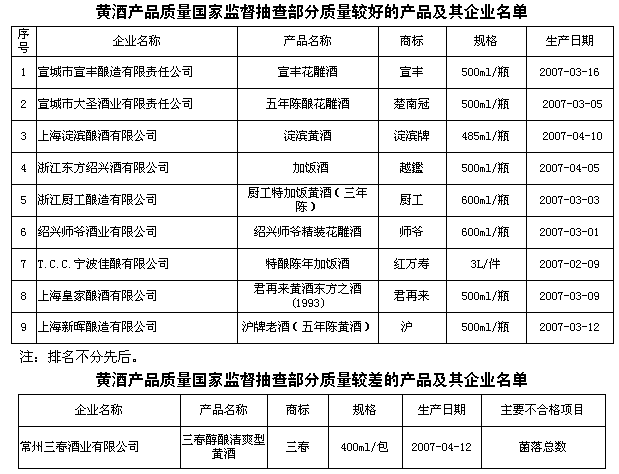為維護消費者的合法權益,促進黃酒行業健康發展,國家質檢總局組織對黃酒產品質量進行了國家監督抽查。共抽查了上海、江蘇、浙江、安徽等4個省52家企業生產的52種產品(不涉及出口產品),產品實物質量合格率為92.3%。