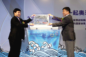 圖為聯想集團高級副總裁兼大中華區總裁陳紹鵬(左)和國家體育總局水上運動管理中心副主任劉愛杰(右)共同為“聯想中國水上運動科學化訓練工作站”揭牌。