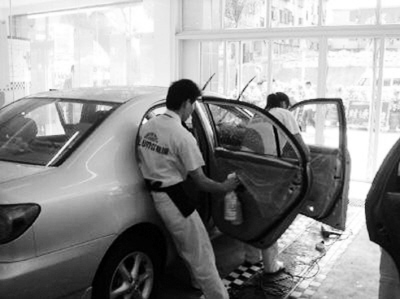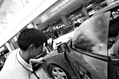 武昌某美容店員工小張向筆者出示了近100張從店里帶出來的太陽膜樣品。筆者看到,這100張太陽膜從顏色到透光度各不相同。小張介紹,這些太陽膜是韓國一家工廠生產的,進價是160元/卷,每卷12米長,1.52米寬。 “進價雖然一樣,但售價有差異!毙埬贸鲆环N內外皆是銀色、類似雙面鏡子似的太陽膜,“這種一般賣6000元/車,實際使用長度是1.7米,成本價就是160元÷12×1.7=22元! 小張介紹,目前,市場上流通的劣質太陽膜多來自中國臺灣、韓國等,一般進價是150至260元/卷不等。 這種太陽膜能賣出高價,一般依靠“打碼”的方式。小張介紹,購回太陽膜,第一步就是找專業打碼店,根據需要,讓對方按照自己的需求打上“雷朋”、“3M”等知名太陽膜品牌的商標;銷售時就按照知名品牌的太陽膜價格銷售。 另外就是偽造名牌商標。在小張的陪同下,筆者暗訪了武昌中北路、八一路、珞獅路等數家汽車美容店。他們所提供的太陽膜品牌令人啼笑皆非。 如美國雷朋太陽膜在市面上只有“雷朋”、“雷朋藍鉆”兩種產品,而我們看到了諸如“雷鵬”、“雷蓬”等名稱極為類似的商標產品。甚至有商家宣稱“雷鵬”