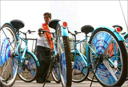 8月20日,在北京地鐵大望路租車點,一名工作人員在整理出租的自行車。為了進一步減少汽車尾氣對大氣的污染,北京市提倡市民騎自行車出行,啟動了公共單車推廣活動。目前已在城區數十個自行車出租點投放了5000輛自行車。奧運會前,自行車出租點將增至200個,將有5萬輛自行車供出租。 新華社發(卓恩森 攝)