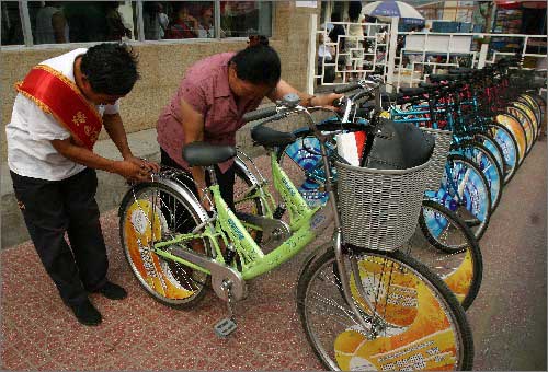 8月20日,一名記者在租車點采訪時試騎出租的自行車。新華社發(卓恩森 攝)