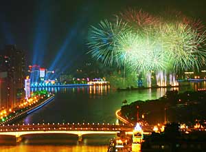 2007年春節,廣州珠江白鵝潭江面舉行煙花會演。攝影/本報記者