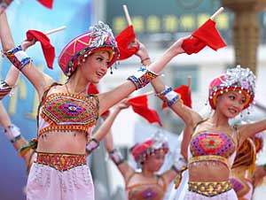| 身著民族服裝的土家族演員們在表演傳統民間舞蹈。新華社記者 程敏