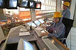 | 兩位技術人員在武鋼二熱軋生產線監控鋼材生產情況。新華社記者 郝同前 攝 |