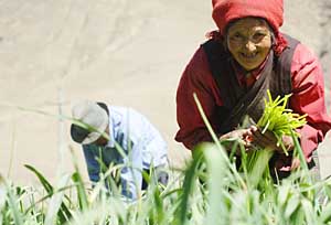 | 西藏山南地區乃東縣的農民喜收蒜苔,當地政府進行農業結構調整取得明顯成果。 | 在湍急水流的沖擊下,西藏白朗縣貴熱村的廠房里的四臺水磨發出了隆隆的轟鳴聲,旋舞的磨盤下,細密的糌粑向雪花一樣落入收集槽里。已經在這個名為康桑農產品加工廠里工作兩年多的達娃頓珠說:“一個磨盤一天一夜可以磨一千斤糌粑,產品銷路非常好,除了拉薩、日喀則,還賣到了尼泊爾! 眼下,像康桑這樣的特色農產品加工企業正在西藏不少地區蓬勃興起,成為當地農村、農業經濟增長的新亮點。西藏自治區人大常委會副主任洛桑頓珠說,充分利用生態條件,將環保和經濟發展相結合,是雪域高原特色農業發展的必經之路。